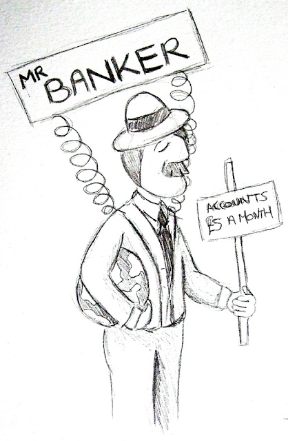 Day 241 of the Doodle Olympics - Do bankers own the world? I was listening to something where someone said that banks should have never been free. This made me think. I do believe that if you are using a service, you should pay for it, but how would that work considering we are forced to have accounts. You need an account to get paid by an employer, to pay for bills etc, but what about the people that don't earn very much? What about those that lose their job and have to watch their pennies? £5 for example, may go unnoticed by most people, but to some it is still a crucial amount of money.